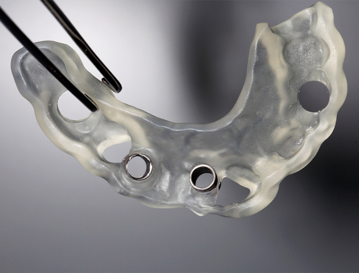 Es un dispositivo 3D diseñado a partir de tomografías y escaneos que guía la colocación precisa de implantes dentales. Facilita una cirugía más segura, rápida y predecible.